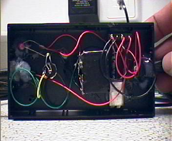 Die EL-Folie wird dann auf das Maß des Displays zurechtgeschnitten (Cuttermesser, Schere etc.). Die Folie hat an einer Seite zwei Anschlüsse wo später der Inverter angeschlossen wird und man darf praktisch überall schneidern wenn man nicht diese Anschlüsse abschneidet. Die abgeschnittenen Reste werden unbrauchbar. Eine 2-Adrige Leitung (am besten abgeschirmt aber keine Pflicht) wird dann an der EL-Folie angeschlossen und aus dem Gerät geführt (bei Bedarf auch mit einer Steckverbindung). Bei der Wahl der Steckverbindung sollte darauf geachtet werden, dass die Anschlüsse, die von der Inverterbox kommen, nicht berührbar sind, da es sich um Hochspannung handelt. Die Leitung geht dann in die externe Inverterbox, in der sich u.a. der Inverter befindet. In meinem Beispiel ist es noch immer die erste Version und daher sehr unsauber aufgebaut - sie erfüllt aber ihren Zweck. Ebenfalls in der Box integriert habe ich einen Festspannungsregler (7805) der die Spannung für den Inverter auf 5V konstant hält sowie einen Gleichrichter und einen Kondensator zur Glättung. Der Gleichrichter, Spannungsregler sowie der Kondensator zur Glättung sind nur dann notwendig wenn man kein Steckernetzteil verwendet, welches dies schon eingebaut hat. In meinem Fall habe ich die "Bastelkiste" (Keller :-)) geöffnet und das verwendet, was ich dort gefunden habe :) Ein Schalter ist natürlich Pflicht das die Folie ja nicht die ganze Zeit leuchte soll.